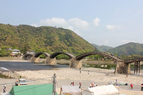 山口県岩国市にある錦帯橋。 錦川に架橋された5連の木造アーチ橋です。